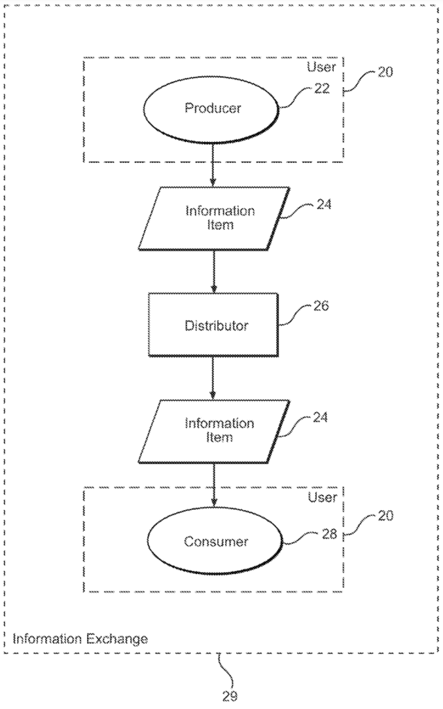 2.1 The invention in claim 1 of this request concerns a method for determining whether to include an information item into an information stream in an information exchange. This could be, for example, a football score in a news feed, but, of course, the claim covers many other possibilities. The news item comprises contents, for example “Manchester City 2 – Nottingham Forest 0”, and a meta description comprising hierarchical data used to describe the content (for example, “Football” – “English Football” – “English Premier League”). The information exchange is a portal or service that facilitates the flow of information items to a consumer.