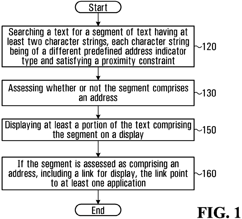 The application proposes detecting a physical address such as a street address within a text message, creating a link for this physical address so that selecting the link will result, for example, in the address location being displayed on a map (description, paragraphs [0029] and [0030]).