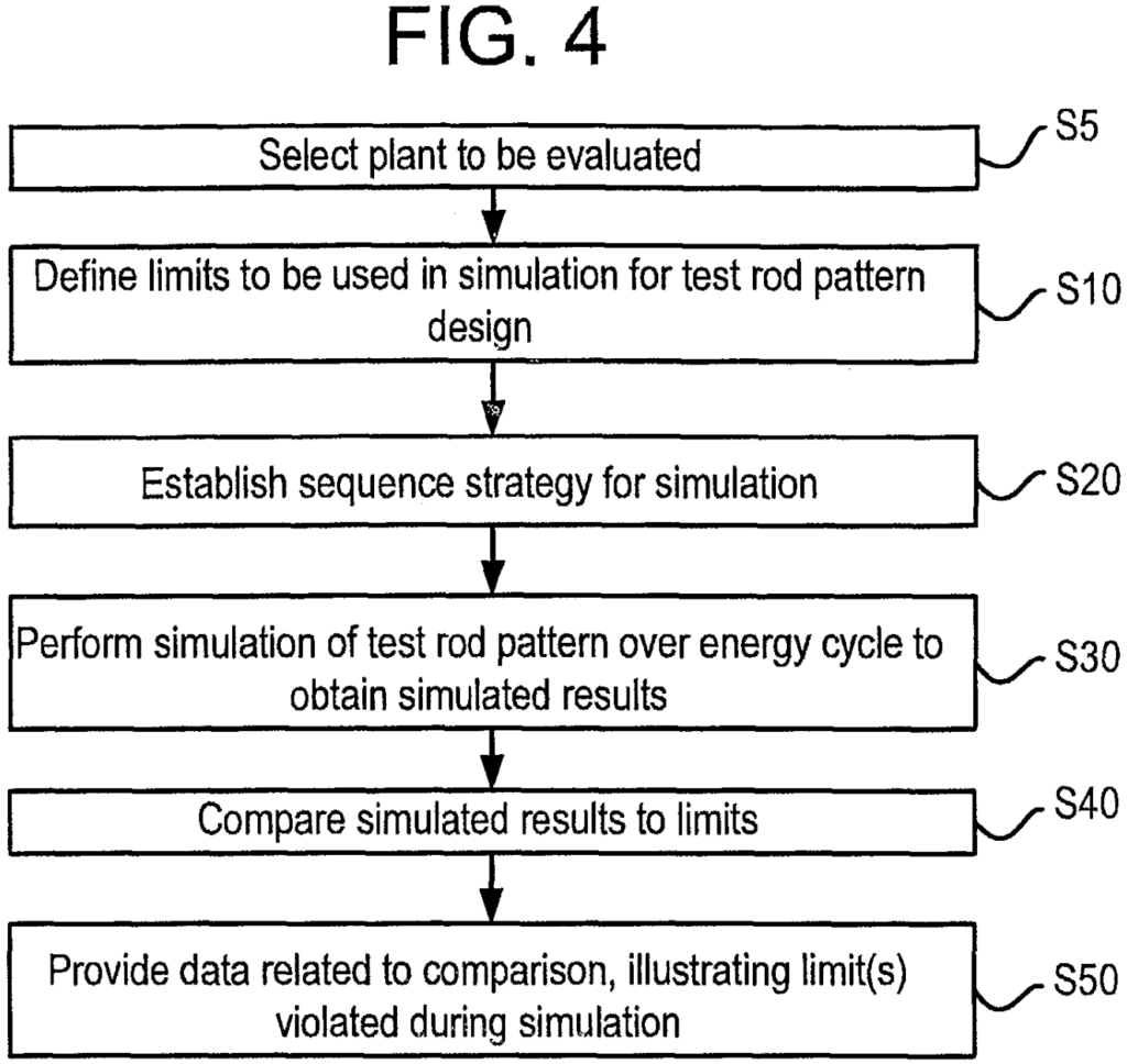 [0006] A Nuclear Regulatory Commission (NRC) licensed core simulation program reads the resulting input file and outputs the results of the simulation to a text or binary file. A designer then evaluates the simulation output to determine if the design criteria has been met, and also to verify that no violations of margins to thermal limits have occurred. Failure to meet design criteria (i.e., violations of one or more limits) require a manual designer modification to the input file. Specifically, the designer would manually change one or more operation parameter and rerun the core simulation program. This process was repeated until a satisfactory rod pattern design was achieved.