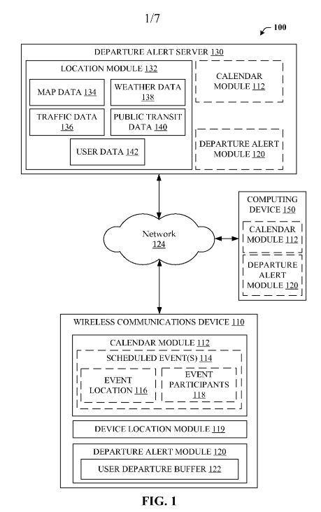 Looking at Figure 1 of the application, a user may populate a calendar module 112 with an event 114 at a specified location 116. A wireless device 110 may then calculate a departure time for this event by comparing its current location to the scheduled event location 116. If the two locations differ by more than a given threshold, the wireless device estimates the travel time from the current location to the event location. Finally, the device may determine a departure time from the estimated travel time and the scheduled event time and may generate an alert by comparing the departure time and the current time.