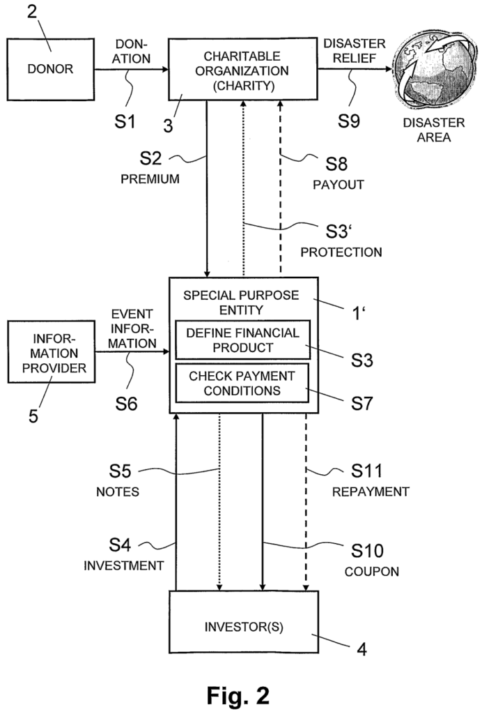 1.3 The invention achieves this by providing a “special purpose entity” (“special purpose vehicle” in the claims) 1′ which offers a financial product S3 (e.g. a security, or another financial instrument) in return for a premium S2 from the charitable organisation (or donor directly), see page 2, last paragraph, to page 3, first paragraph.
