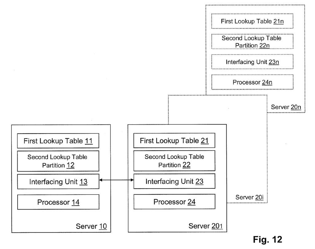 2.1 The application proposes to split the lookup table between the set of active servers according to a partitioning table – e.g. by splitting the hash values in equal ranges. One of the active servers acts as a master server which, upon a change in the number of servers, recalculates the partitioning table, i.e. the ranges of hash values, and sends it to all other active servers (pages 5, 6 and 9). The servers communicate with each other to transfer the needed lookup entries in accordance with the new partitioning table.