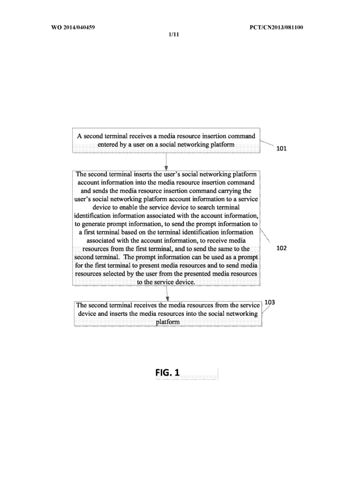 The application underlying the present decision mainly concerns inter-terminal interaction to facilitate publishing of content to a social network. The invention addresses a situation in which the content is not stored on the currently used terminal (“second terminal” of claim 1). Accordingly, there is a need for efficiently transferring the required content from a specific group of terminals on which the content is stored to the currently used terminal for publishing the content. (cf. abstract and paras. [0004] and [0005] of the application). This problem is solved by using a server (“service device”) to access content from the specific group of terminals (terminals which have been used in the past to log into the user’s social network account). The server keeps a list of these terminals (“the service device memorizes the matchup between the account information and the terminals’ identification information”). Once a user wishes to publish content (“a media resource insertion command”), a request is transmitted to the server, which then determines based on the user’s social network account information the terminals to be accessed and selects one of them (“the first terminal”). The desired content is then transmitted from the first terminal to the second terminal and published.
